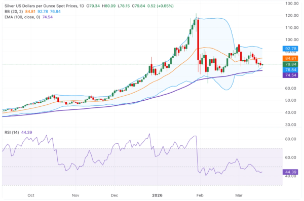 Silver price (XAG/USD) continues to exhibit positive momentum, climbing toward $80.00, driven by heightened safe-haven demand, geopolitical tensions, and inflationary concerns. However, technical indicators such as the RSI, Bollinger Bands, and proximity to the 100-day EMA point to a mildly bearish near-term bias.